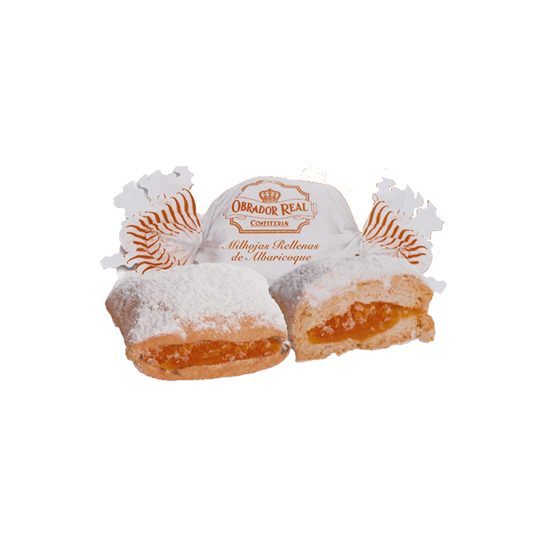 Elaboración hojaldrada rellena de un cremoso de albaricoque confitado. Desprende un dulce aroma a fruta que junto a su atrayente color invita a degustarlas.