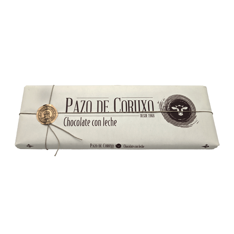 Deliciosa tableta de 400g de chocolate con leche. Empaquetado en papel blanco hueso y precintado con una cuerda y un sello adhesivo dorado en relieve, de garantía.