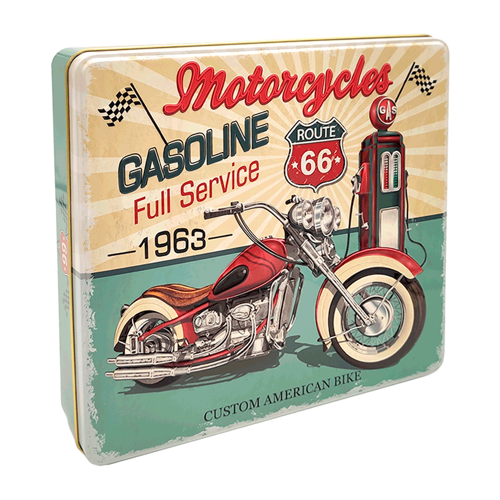 Inspirada en las travesías por la Ruta 66 a través de llanuras y desiertos, recuerda parar a repostar y a reponer líquidos. Esta te recordará a los anuncios de los años 50. Reutiliza esta lata para guardar tus cosas preferidas, o para adornar un estante de tu oficina.