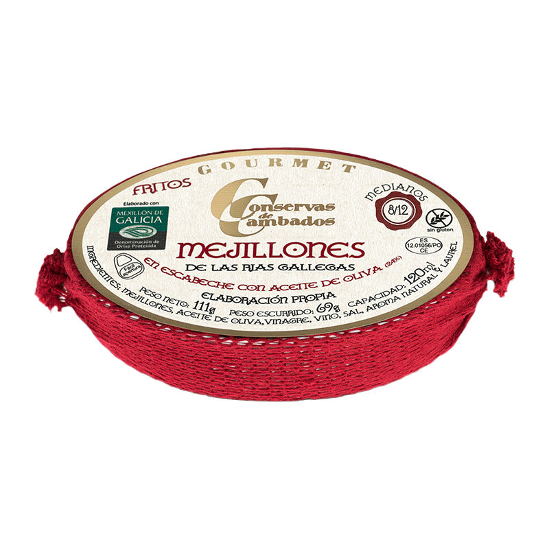 INGREDIENTES Mejillones de las Rías Gallegas en escabeche con aceite de oliva de elaboración propia artesana. Calibre 8/12 medianos. Peso neto 111g.