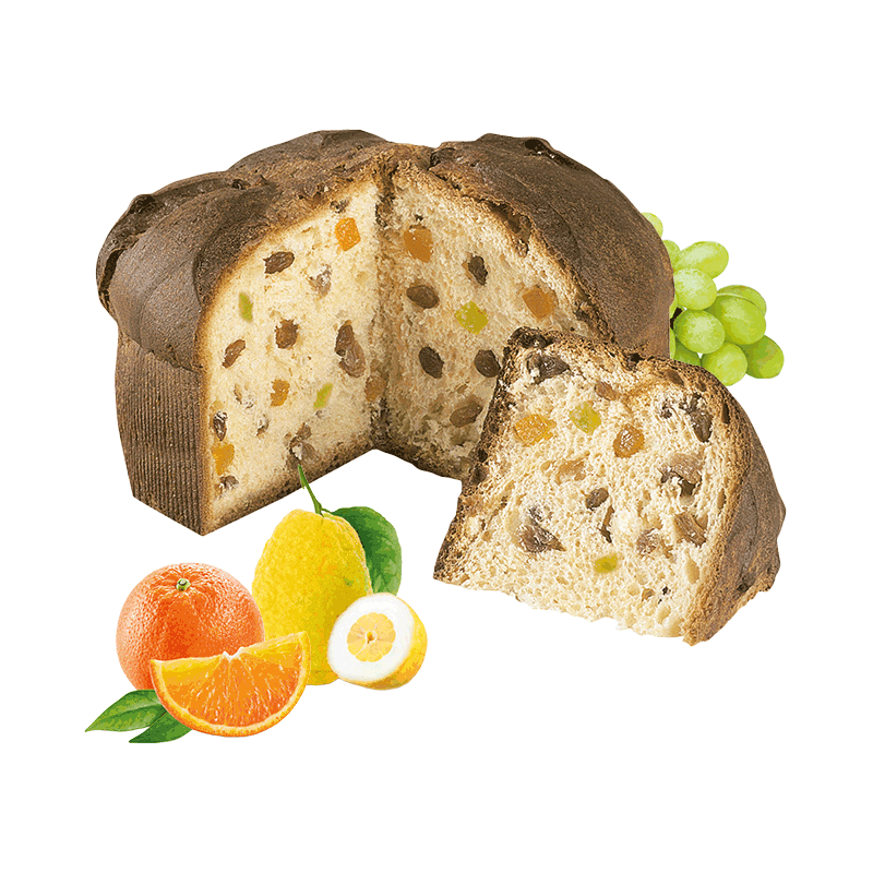 INGREDIENTES Harina de trigo, huevos frescos criados en suelo en Italia, pasas Sultana (16%), mantequilla, azúcar, cáscaras confitadas de naranjas de Sicilia y limones de Calabria (8%) (cáscaras de naranja y limón en proporción variable (53%), jarabe de glucosa-fructosa, azúcar, zumoo de limón concentrado), levadura de masa madre natural, yema de huevo fresca cultivado en suelo en Italia, emulgente (mono y diglicéridos de ácidos grasos de origen vegetal), azúcar invertido, sal, manteca de cacao, sabores naturales.
